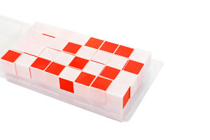正方体 3cm×3cm×3cm,64个;其中三面涂红色的8个,两面涂红色的24个,一面涂红色24个,六面均不涂红色的8个,不涂红色的面均涂白色。